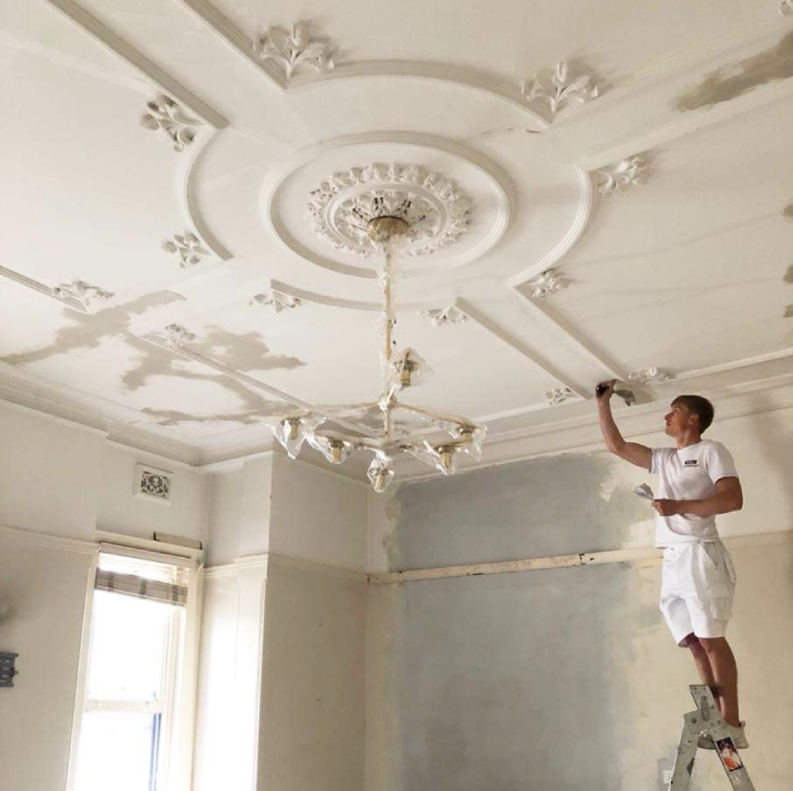 Painter hand painting details onto a ceiling. | Source: The Artful Decorator
