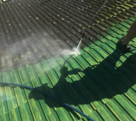 Roof being cleaned by a high pressure cleaner.