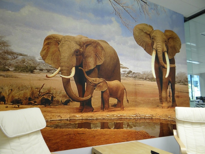 Elephant wallpaper inside an office building. | Source: Creme De La Creme Decor