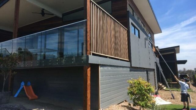 A professional cleaner uses a long pole to clean the upper windows of a two-storey home. - window cleaning cost
